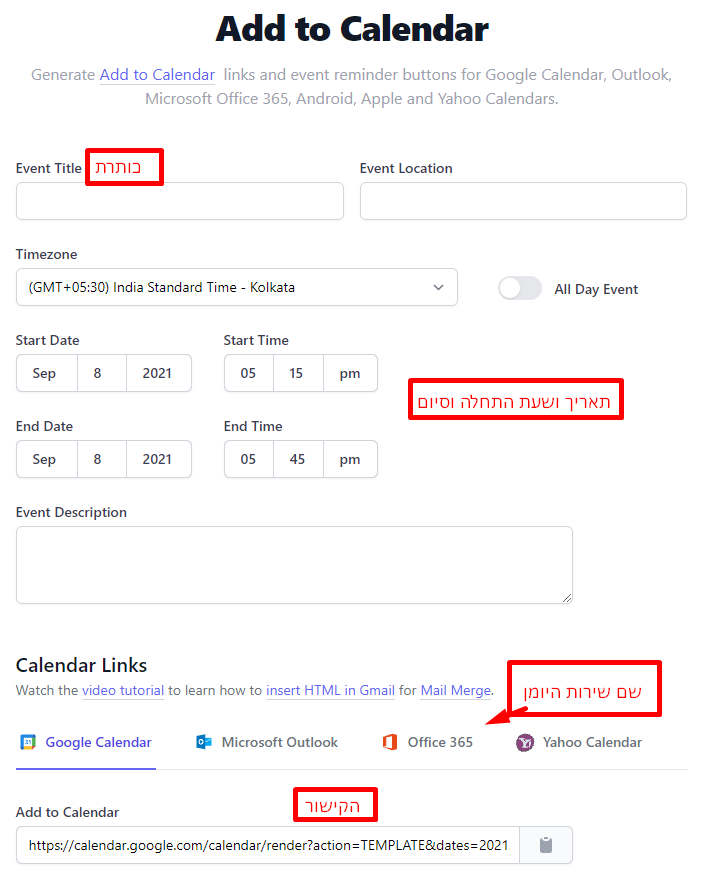 לעיתים אנו רוצים לשלוח הודעת SMS או מייל עם קישור להוספת אירוע ליומן, כך שהאירוע יופיע להם ישירות ביומן כך שיוכלו לשריין לעצמם את התאריך ולקבל תזכורות לפי הצורך.