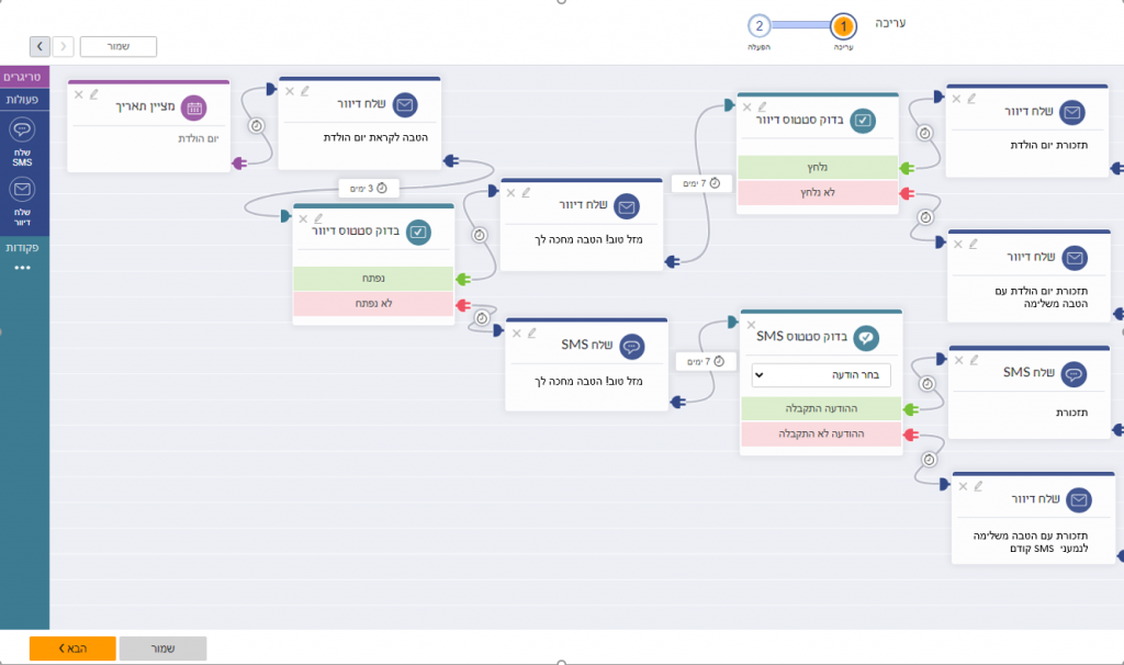 כעת שהגדרנו מה הנסיבות שבהן התהליך יחל לפעול נעבור לליבת העניין – להגדרת תוואי התהליך עצמו – מה הנמען שלי יחווה מרגע שהוא נכנס לתהליך. במסגרת זאת נגדיר את הדיוורים שהנמען שלי יקבל, הודעות ה- SMS שיגיעו אליו, מרווחי הזמן שיעברו בין אבני הדרך בתהליך ופעולות נוספות ככל שנרצה כמקובל בתהליכי אוטומציה.