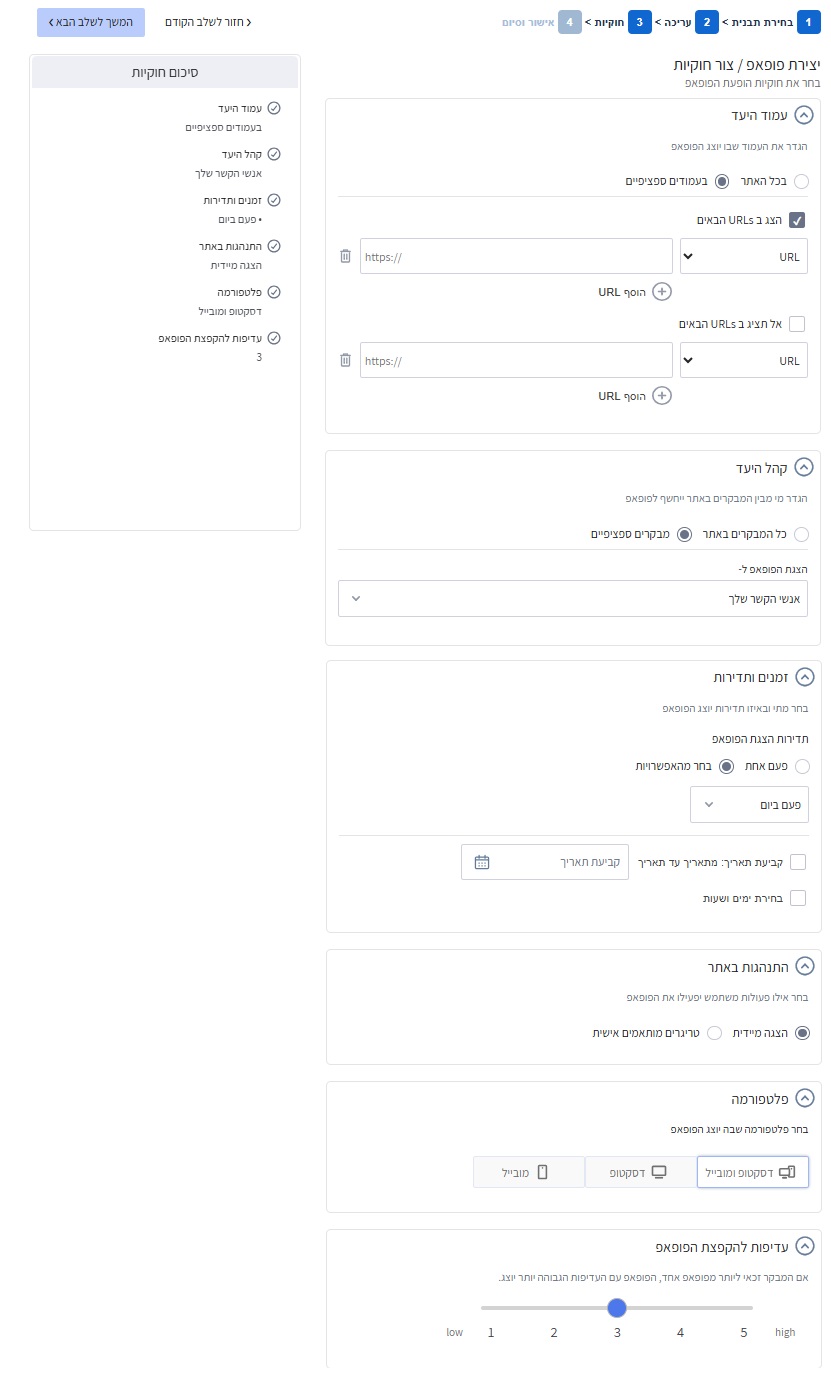 - הגדרת החוקיות של הפופאפ – המסך יציג לכם שורה של הגדרות שניתן לקבוע ביחס לחוקיות ההקפצה של הפופאפ. הללו כוללות את העמודים בהם תרצו שהפופאפ יקפוץ, את קהל היעד שלו הפופאפ יקפוץ (מוכרים למערכת/ מאושרים לדיוור ועוד), את התזמון בו הפופאפ יקפוץ (ימים, שעות, חגים, סופי שבוע, טווח תאריכים מסויים), את תדירות הקפצת הפופאפ למבקר נתון (פעם אחת בלבד, מספר פעמים בזמן נתון), טריגרים של פעולות שהמבקר ביצע באתר ועוד. כמו כן כאן תוכלו להגדיר את העדיפות של הפופאפ במידה והמבקר עונה על תנאים של יותר מפופאפ אחד להצגה: