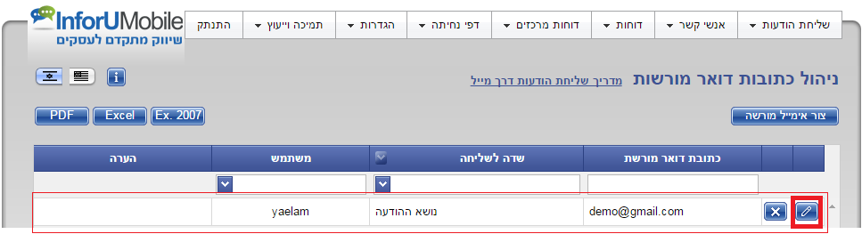 4. לאחר סיום קביעת ההגדרה ניתן לראות אותה במסך ניהול כתובות דואר מורשות. ניתן ללחוץ על עט העריכה על מנת לשוב אליה, לעדכן ולהוסיף הערות במידת הצורך.