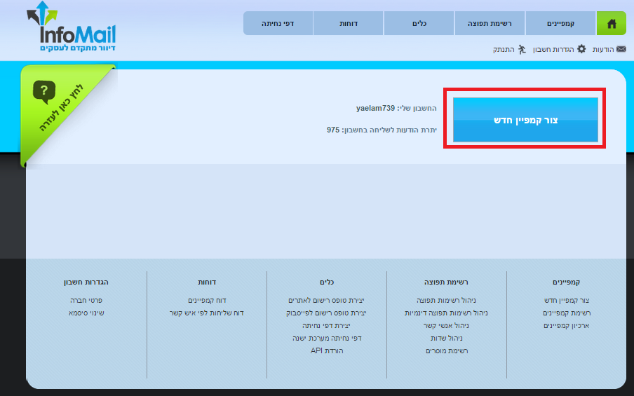 בניית הקמפיין מתחילה מלחיצה על כפתור צור קמפיין חדש במסך הבית (או במסך רשימת הקמפיינים):