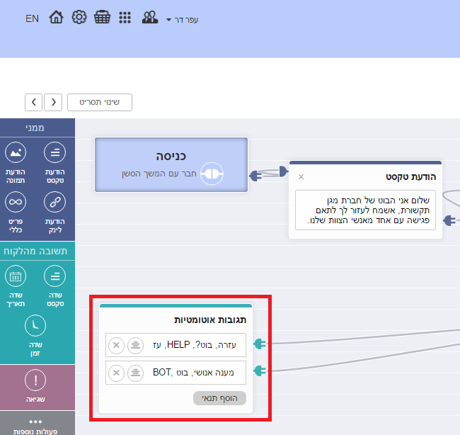 נחבר את תחילת השיחה לא לפקד הכניסה אלא לפקד התגובה האוטומטית; נגדיר את המינוחים הספציפיים שבהזכרתם בשיחה יקפיצו את הבוט; נחבר כל מינוח או קבוצת מינוחים לתוואי השיחה המתאים. בצורה זו בעזרת פקד התגובה האוטומטית נוכל להשיג את השילוב שבין שיחה אנושית לשיחה אוטומטית עם הגולשים.
