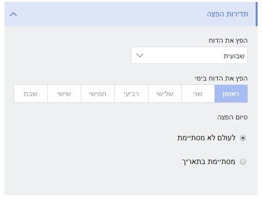 - תדירות הפצת הדוח – באיזה קבועי זמן נרצה שהדוח ישלח אלינו בצורה אוטומטית – יומית/ שבעית/ חודשית/ חד פעמית.