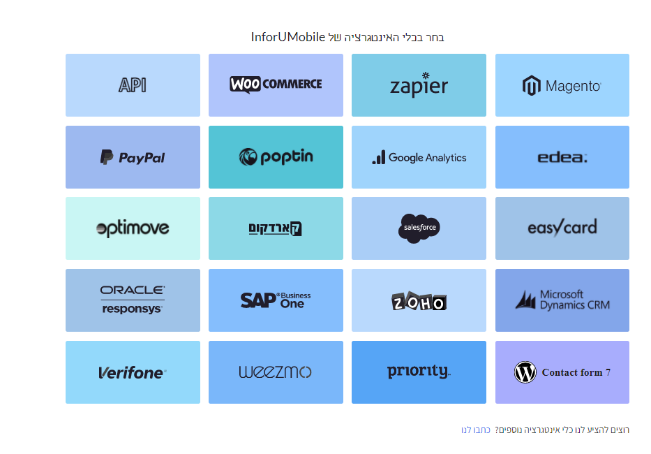 אנו שוקדים על פיתוחן של אינטגרציות חדשות כל הזמן ולכן היצע האינטגרציות שלנו בתהליך מתמיד של עדכון. אנו מזמינים אתכם לעשות בהן שימוש ועומדים לרשותכם בכל שאלה.
