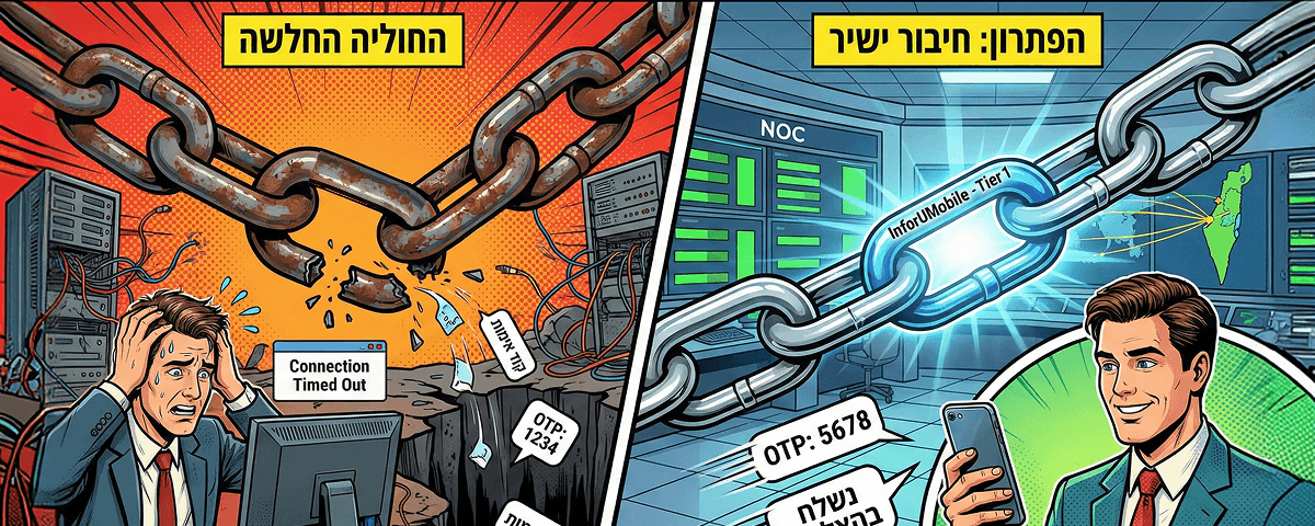 - חיבור ישיר (Direct Connection / Tier-1): זו הדרך שבה עובדים ספקי תשתית רציניים (כמו InforUMobile). יש לנו חיבור פיזי וישיר לליבת הרשת של המפעילים הסלולריים (פרטנר, סלקום, פלאפון, הוט מובייל וכו').
