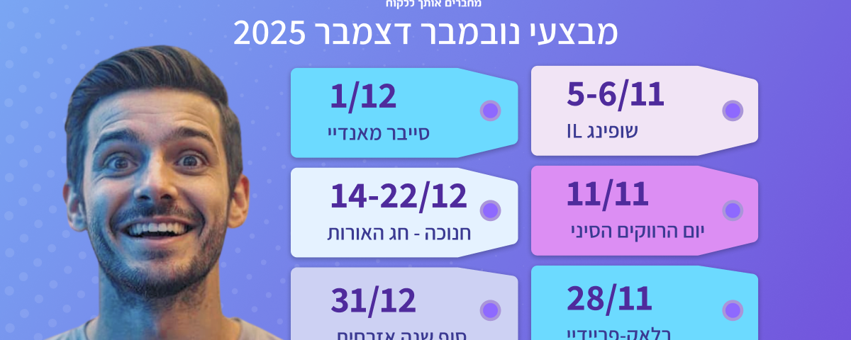 - 28 בנובמבר, יום ו' – בלאק-פריידיי – יום מכירות עולמי שמהווה את פתיחת עונת הקניות לקראת חג המולד, בו חנויות רבות מציעות מבצעים והנחות משמעותיות על מגוון רחב של מוצרים. אמנם לא חג יהודי, אבל חג קניות שבהחלט לקוחות מצפים לו בישראל.