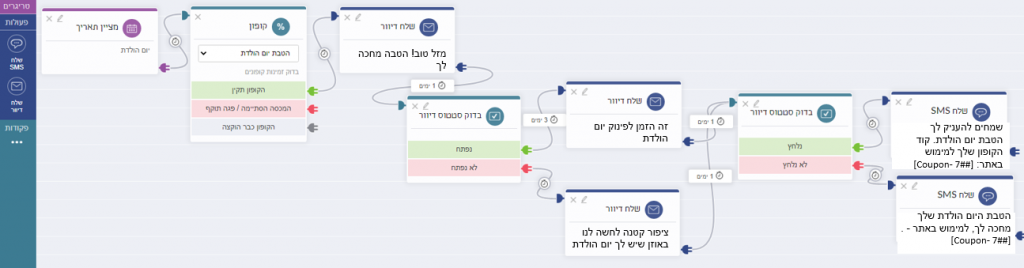 כל גולשת שממלאת פרטים תצורף למועדון ותקבל את קופון ההטבה ישירות לטלפון ו/או לאימייל שלה. דוגמא לתרחיש כפי שנבנה אותו במערכת: