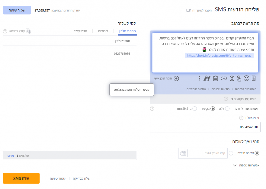 אתם נדרשים לבצע הלבנה חד פעמית של מספר השולח. תוכלו לעשות זאת באמצעות מסך האימות הייעודי במערכת אליו תוכלו להגיע על ידי כניסה למודול ה- SMS (בלחיצה על הכדור הכתום במסך הבית של המערכת) ולחיצה על לשונית אימות זיהוי שולח מספרי תחת תפריט הכלים: